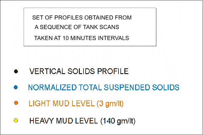 SOLIDS PROFILES - This term refers to a set of measurement data generated during the vertical scanning of the tank. The data consists of individual measurements taken approximately 1 cm apart. The high granularity of these measurements is crucial for flat-bottom tanks, where control ranges are narrow. For taller tanks, the spacing between points can be adjusted at the MODBUS command level to more suitable values to mitigate data handling. A graphic display of consecutive scans offers a dynamic visualization of the process.